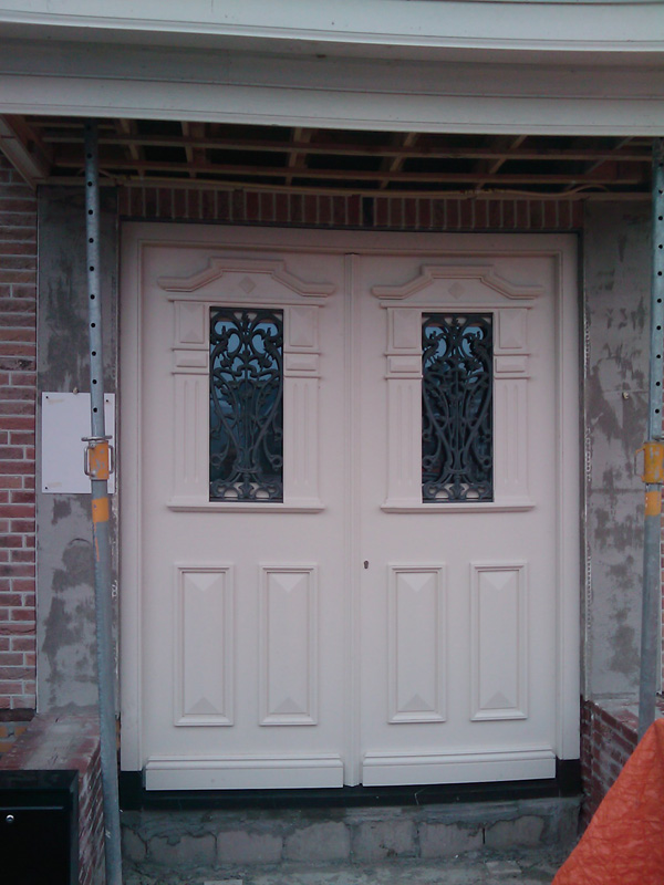 Bij een nieuw gebouwd huis in Medemblik worden in klassieke stijl de kozijnen en de voordeur geplaatst.